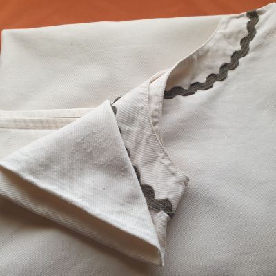Diese solide Tunica rustica mit schöner Wellenborte am Halsausschnitt ist an einer Schulter abgewetzt,- vermutlich wurde sie von einem Mieter mit einer sehr rauhen Rüstung getragen. Der Stoff ist an dieser Stelle sichtbar aufgerauht, aber nicht durchgewetzt (siehe zweites Foto).